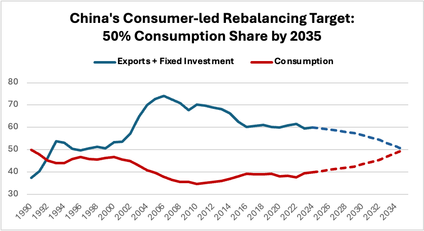 Endless debates have an uncanny way of staying endless, So late last year, I threw in the towel as an advocate for one approach over the others. I conceded to my Chinese friends that it is entirely your choice as to how to best stimulate your consumer sector. In the end, all I really cared about was results — namely, boosting the household consumption share of GDP. I put a target and a date on what I argued was a reasonable objective — a 50% share by 2035, up ten percentage point from the current unacceptably low portion of 40%. I wrote about the feasibility and the simple math of hitting that target, as illustrated in the chart in the below.