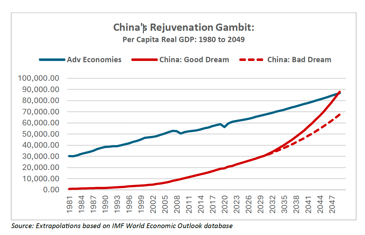 A final consequence of this exercise bears special emphasis. By comparing the difference between the two Chinese growth scenarios — the 5.75% convergence trajectory versus the 4.3% extrapolation of recent experience — we can provide a rough approximation of the rejuvenation deficit. This can be thought of as the difference between the Xi Jinping’s original depiction of the Chinese Dream (the convergence of the “Good” Dream) and an outcome that leaves the Chinese economy mired in its current sluggish state (the “Bad” Dream). The difference, courtesy of the powerful math of compound growth, is a big number. If the current rate of sluggish economic growth persists, by 2049, the rejuvenation deficit would amount to slightly more than $20 trillion (in real PPP terms), or approximately 23% of convergence GDP.